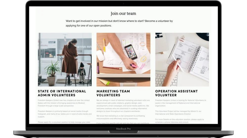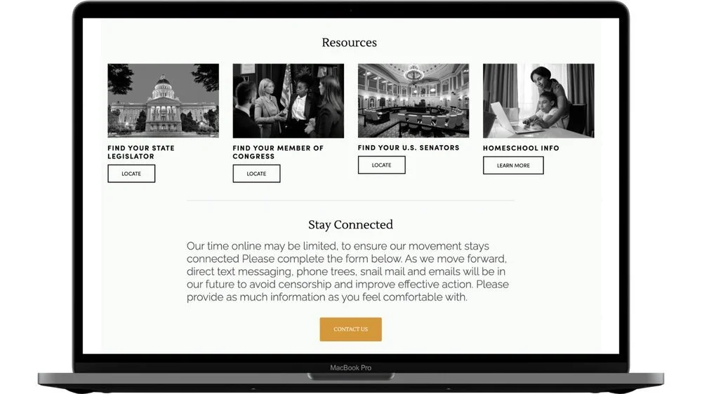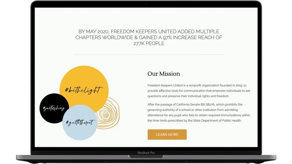 The final redesign of the Freedom Keepers United website incorporates user feedback and a deeper understanding of their needs. The new design offers a cleaner, more streamlined experience, complemented by a refreshed color palette and logo redesign for a more cohesive and user-friendly site.