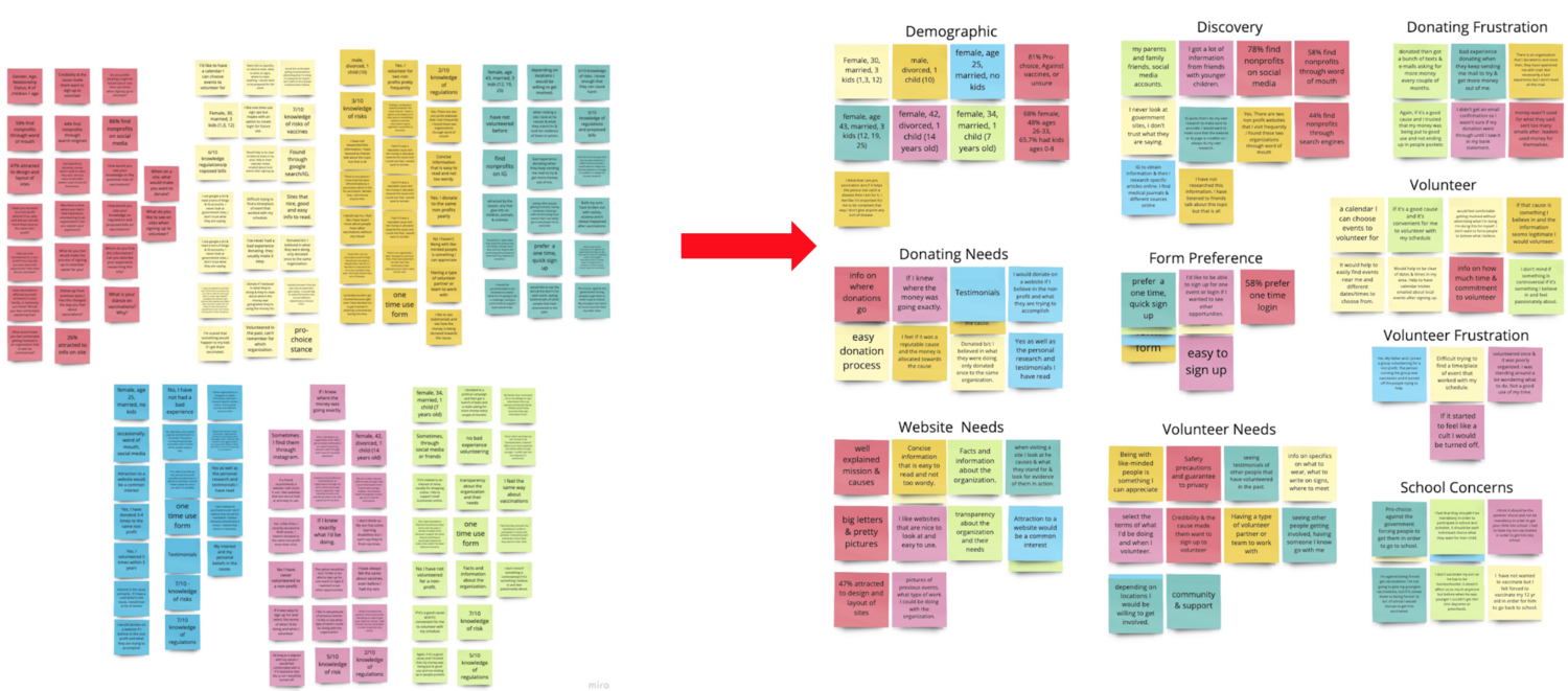 The research used to build the original site was re-evaluated, and a new public user survey was conducted through an online feedback form for current site visitors. The newly gathered insights were organized into an affinity diagram for deeper analysis and understanding.